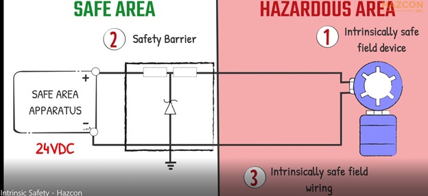 Intrinsically Safe System [as applied to Hazardous (Classified) Locations]. This is what we want to creat, so that it becomes automatically safe as long as no one changes the wiring to the system. This is the best example of what a correctly wired safe system looks like.
